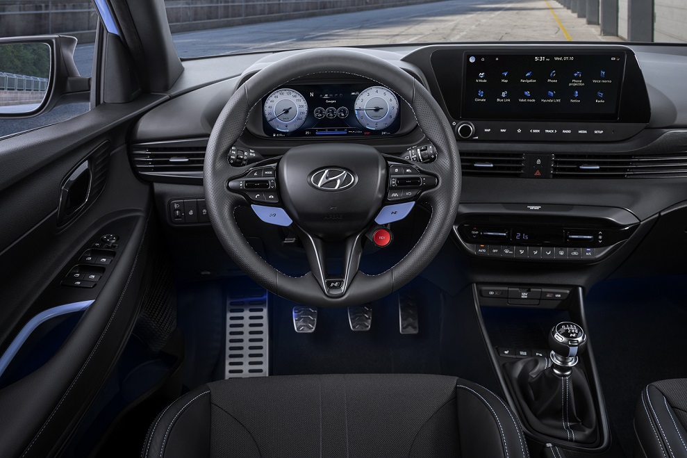 Inside, the all-new i20 N represents a high-performance driving space with a host of N-specific advanced and high-tech premium features. This includes dedicated sport seats with an integrated headrest that are unique to the all-new i20 N, as well as N steering wheel and N gear knob and sporty N metal pedals. The black interior features Performance Blue accents throughout and all‑black head lining.