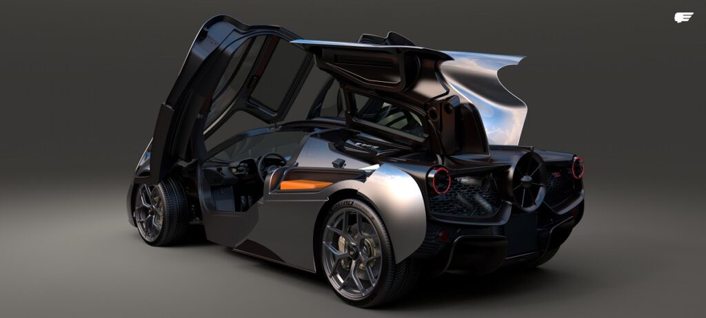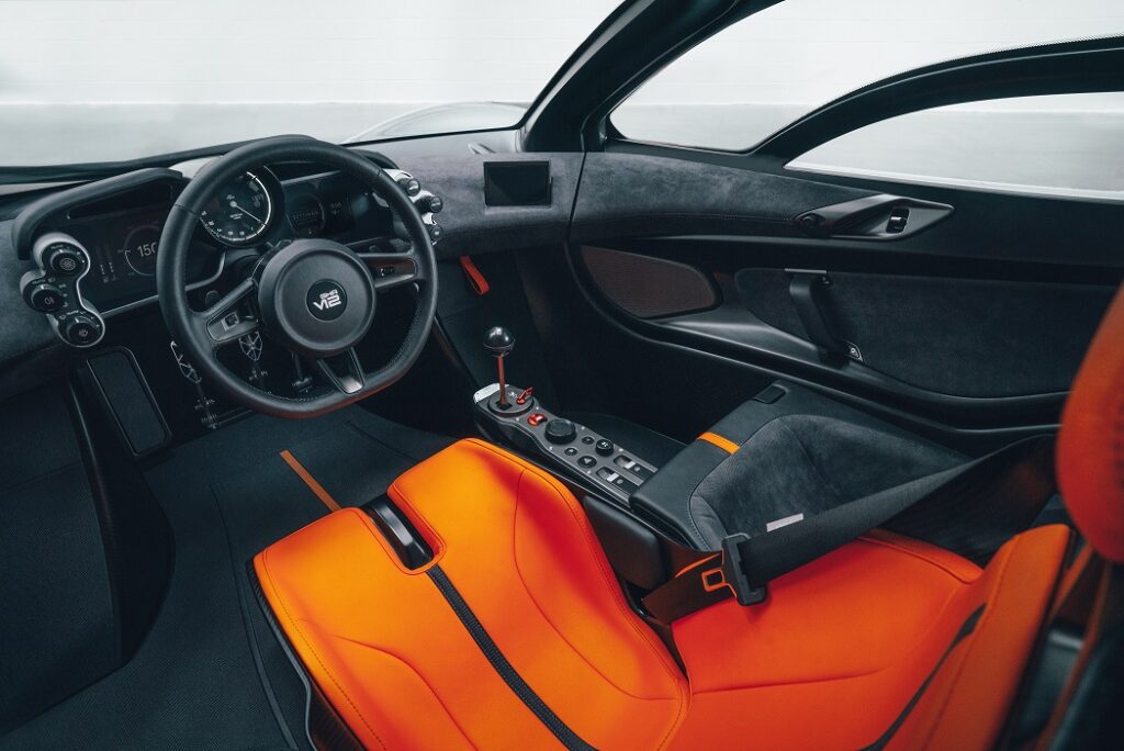 Gordon wanted this car to be used every day and despite all the technology focused on performance gains he says it will be a fairly comfortable GT. When looking at the scale it would be easy to assume the car has no comfort features but in fact, it’s quite well equipped. There is a full HVAC system and a premium 700wat 10 speaker audio system. Apple Carplay and Android Auto come standard and is displayed on the non-touchscreen to the right of the tachometer. The interesting fact both the needle and the tacho are milled from aluminium as Gordon didn’t want any plastic inside. The left-hand screen displays all car information. There are also no side mirrors on the car instead it has two cameras with displays on either side of the cockpit.